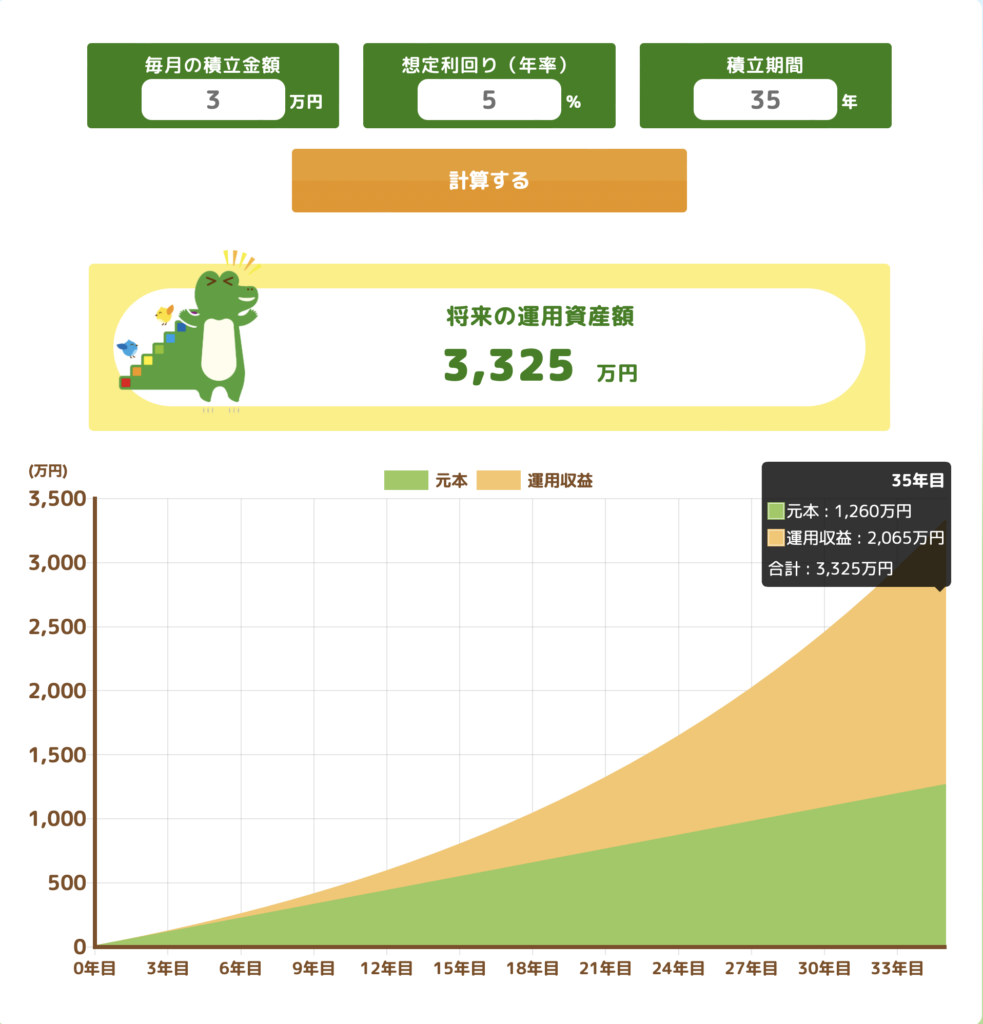 非課税のNISA制度で例えば月々3万円を年利5%で35年間積み立てると元本1260万円に対してなんと運用収益が2065万円となります。これでいけば月々3万円という負担が増えるものの最終的には2065万円もの金額を節約することが可能です。